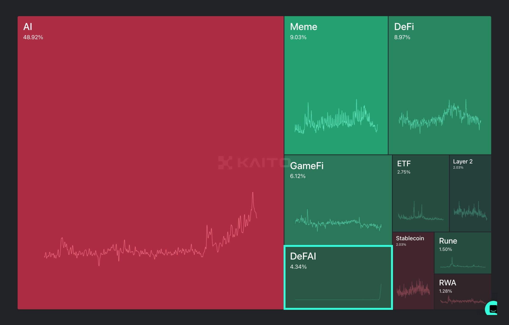 DeFAI stands for “Decentralized Finance + AI” and is the next evolution of AI agents in the web3 space. It is quickly gaining mindshare on X as investors look to capitalize on the next trends in the AI economy.
